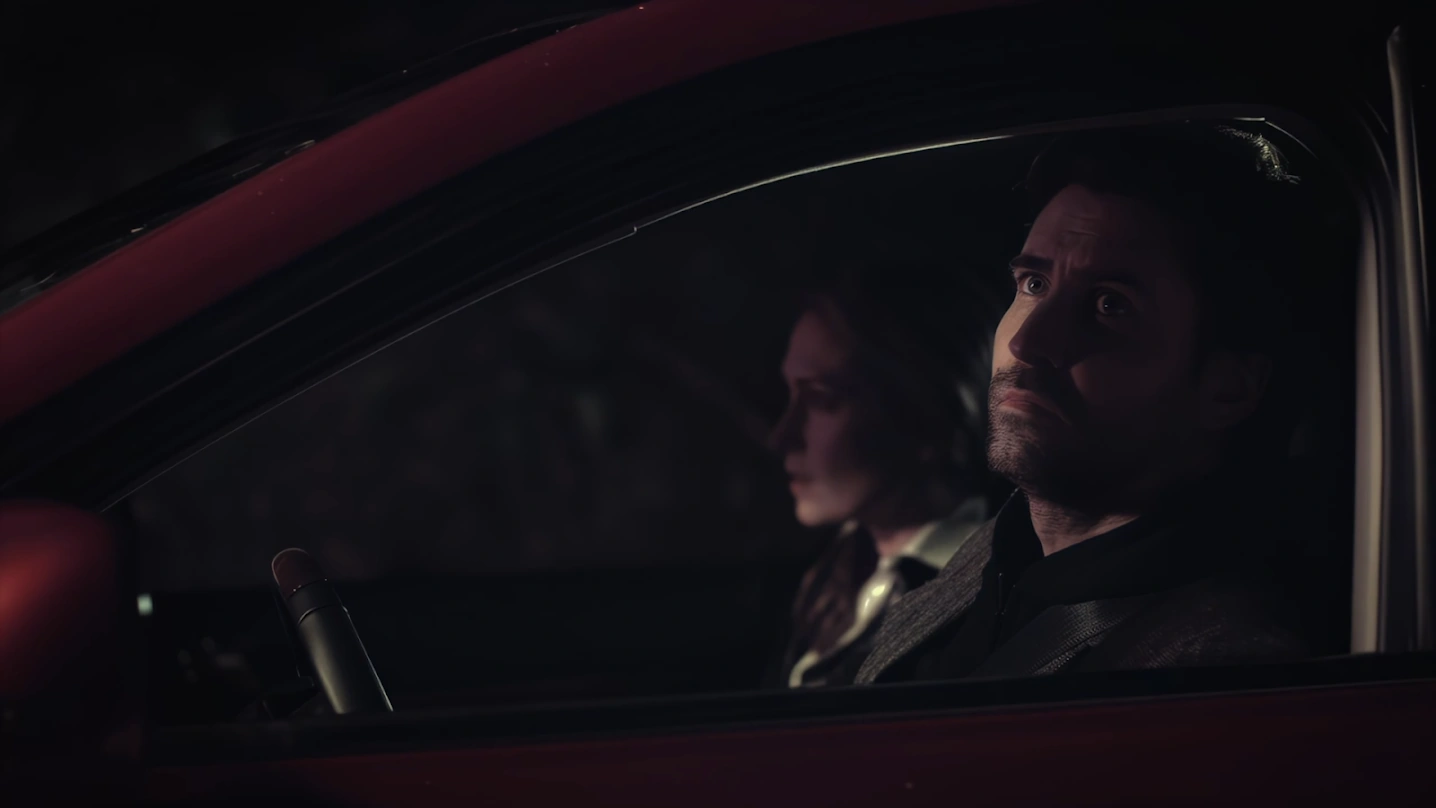 A police deputy lights and places flares on the ground to light up the accident site, with several emergency services and police vehicles around Jake's abandoned car. The deputy then signals an approaching car to stop. The driver, Alan Wake, who is also with his wife, Alice, asks the deputy what happened. He explains that it was most likely a driver crashing while trying to avoid a deer and advises them to be careful on the road up ahead. Alan thanks the officer and he and his wife resume their journey.