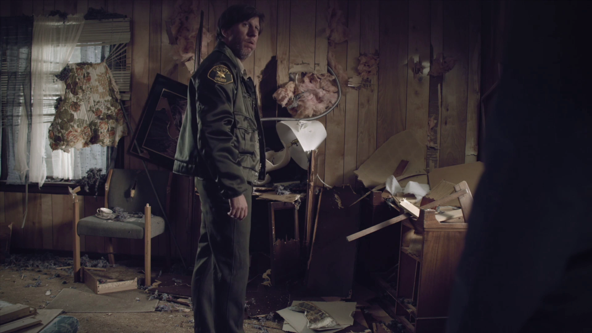 Deputy Mulligan arrives at the Mountain Air Motel. In his destroyed motel room, Jake Fischer is packing his bag when he hears someone knocking at the door. Half-opening the door, he sees Deputy Mulligan and asks him if he can help him. The deputy asks him if he had been in contact with Sam Smith, the owner of the motel. Jake tells him that he has not seen him in days, to which the deputy tells him that he had gone missing and that he found his son looking for him in the woods. He then proceeds inside and sees the state of the room. Lying, Jake claims that he had accidentally left the door open the night before, after which an animal entered and destroyed the room. Seemingly believing the story, Deputy Mulligan states, looking at the damage in the room, that the animal in question was a "14-point stag" and proceeds to show Jake evidence to support his claim, such as "cut patterns" and supposed "horn rib entry points". He also states that the animal was a "trophy deer" and that it would have earned Sam a prize had he been there, attributing his absence to a bender. After finishing his explanation, the deputy states that "the boys are gonna love this" and leaves.