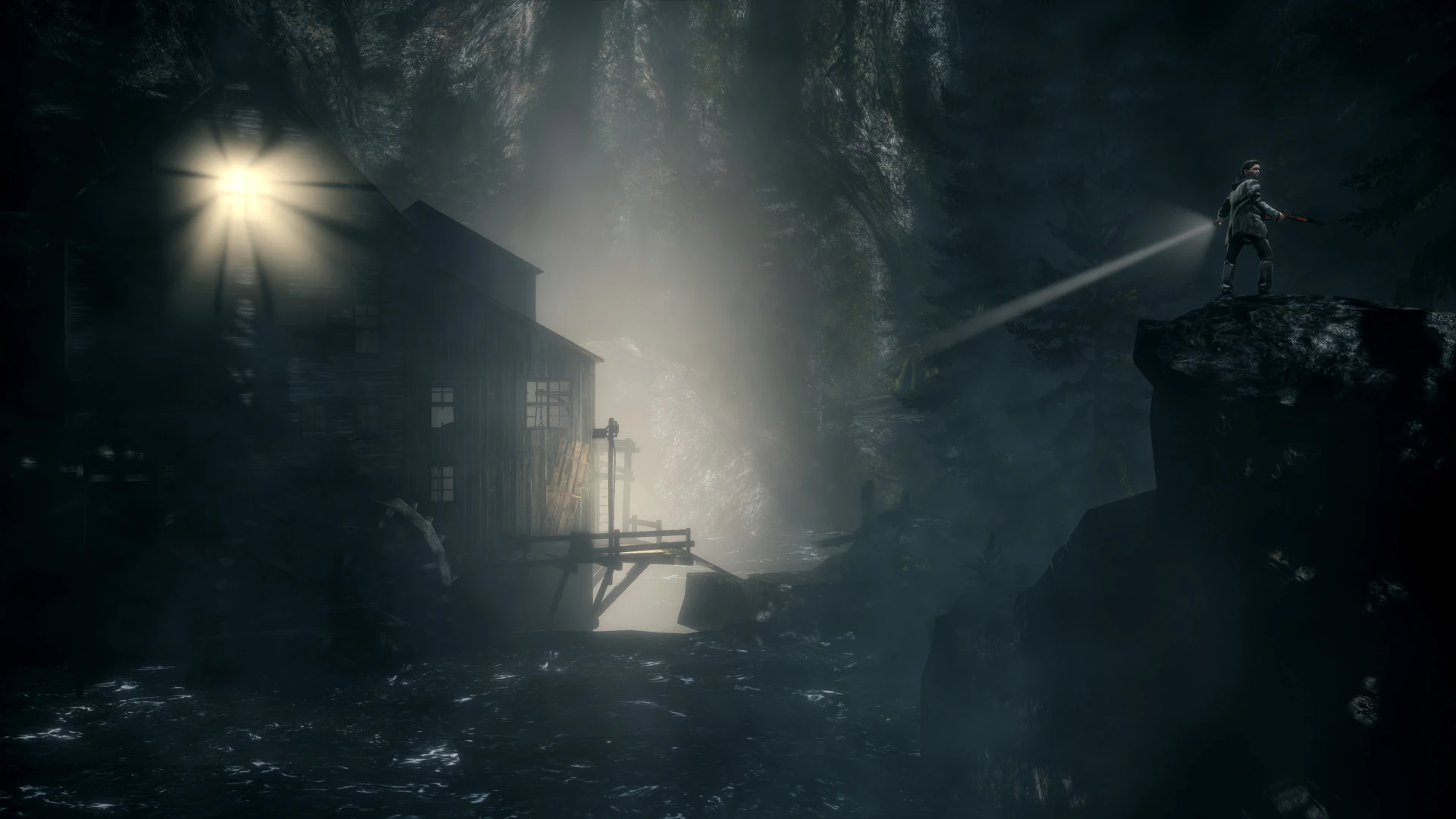 The Mill is found in Episode 2: Taken. It lies in Elderwood National Park and Wake has to head through here to get to the other side of a raging river. The Mill appears to be very old and is filled with liquid darkness.